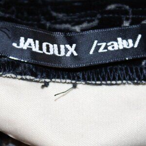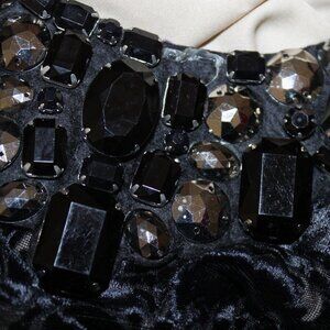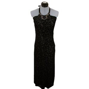 JALOUX Anthropologie black burnout velvet strapless maxi bodycon dress with statement jeweled neckpiece and ribbon strap halter tie. Lined and has some stretch.
