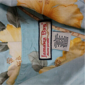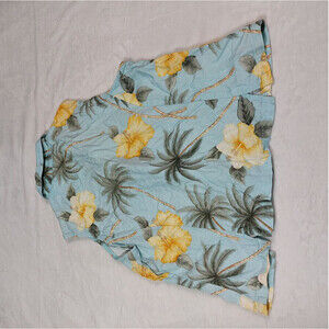 JAMAICA BAY SLEEVELESS BUTTON DOWN SHIRT SIZE LARGE. BLUE WITH YELLOW HIBISCUS FLOWERS AND PALM TREE TROPICAL PRINT. 100% RAYON. MEASUREMENTS PROVIDED IN PHOTOS.