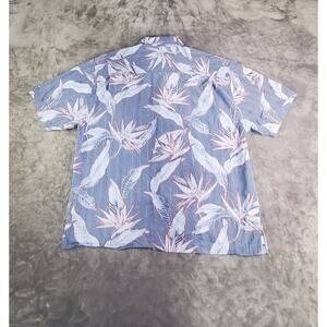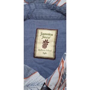 The Jamaica Jaxx Shirt for men in size 2XL is a tropical and Hawaiian-themed button-up made from 100% silk. It features a graphic print of blue tropical leaves, short sleeves, a collared neckline, and a spread collar style. Ideal for travel, parties, casual occasions, and outdoor activities, this shirt is machine washable and easy to care for. With a regular fit and woven fabric, this shirt adds a touch of beach, Hawaiian, and tropical flair to any outfit, making it a stylish and comfortable option for the warmer seasons. Caja29-20