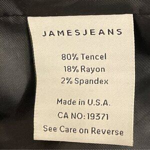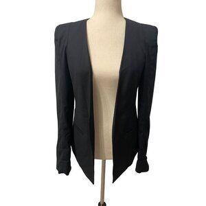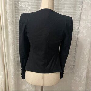 James Jeans Black Blazer. 5 button cuff; two jetted pockets; very light shoulder padding; fully lined; open style coming to point in front, cropped in back; Tencel/rayon blend. NOE: NO SIZE TAG. Please see measurements to determine proper fit. Approx 17” armpit to armpit, 26.5” shoulder to hem front, 20” shoulder to hem back, 25” sleeves.