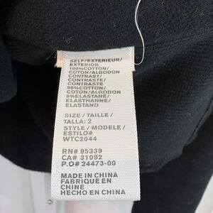 Collared, double breasted button front, long sleeves, hand pockets, slightly cropped length. Cozy, thick soft cotton knit in black with stretch cotton ribbed trim.