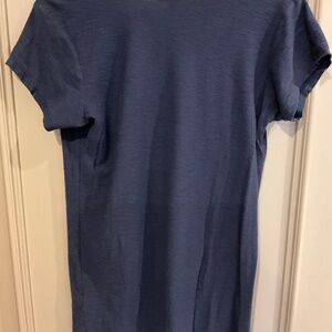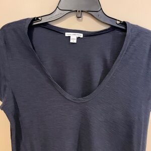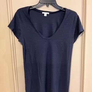 JAMES PERSE Navy Blue Deep Scoop Neck T-Shirt Short Sleeve Tee Shirt Size 3 which fits Medium/Large. Several small pin dots on front. Thin breezy cotton fabric to keep you cooler in the heat of the summer. 51% cotton/49% modal. Machine washable.