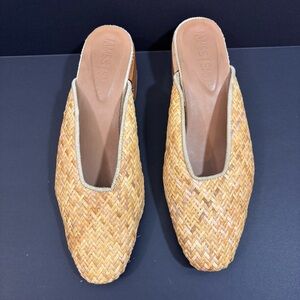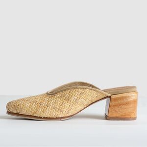 A popular slip-on mule featuring an upper made from woven rattan or wicker, a leather lining, and a statement wooden block heel.