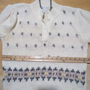 *** This is an adorable hand knit sweater - there is a slight discoloration located on the left hand side under the arm pit and a very tiny stain in back - these discolorations are hard to see in certain light - and I feel does not hurt the integrity of this beautiful vintage sweater*** - you can see this in the last 2 pictures