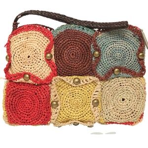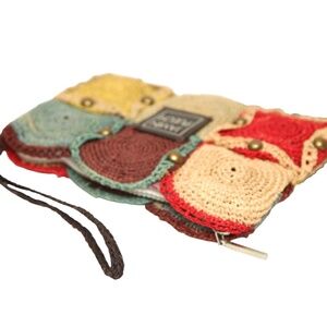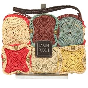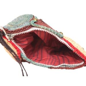 JAMIN PUECH Raffia Leather Bag Wristlet Wrist Strap Tan Red Brown Green
