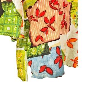 Medley of colorful abstract prints in greens, red, orange, blue, and yellow