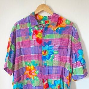 JAMS WORLD Hawaiian Shirt 80s Pop Art Bold Floral Colorful Plaid Print Large