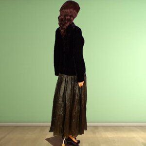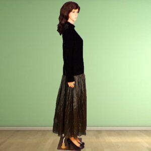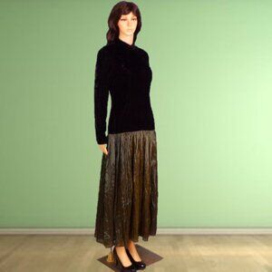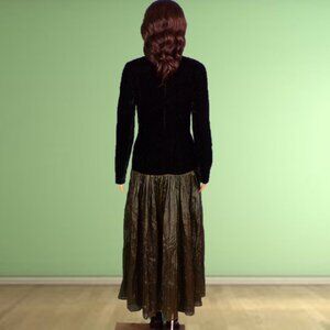 ELEGANT IN ITS SIMPLICITY, THIS LOVELY 2-PART LONG-SLEEVE FIT-AND-FLARE MAXI DRESS BY JAN BARBOGLIO, SIZE 6, is gently pre-owned, in near-perfect condition. The fabric/care label is not quite fresh and new looking (pictures #10 & 11), but the dress itself is free of defects, damage, or signs of wear. In classic fit-and-flare style, it consists of a long-sleeve bodice with a low standup collar joined to a widely flaring (almost full-circle) full-length skirt. The bodice is black velvet, the skirt a delicate, crinkly, crepe-like material in a muted shade of forest green. Ruching at the bodice seam creates pleating in the upper part of the skirt. The bodice is lined in black fabric, the skirt unlined. It closes with a zipper in back. It was made in the U.S.A. The fabric is 100% rayon, dry clean only recommended. The stated size is 6, but prospective buyers are encouraged to compare the measurements with those of a dress that they know fits well prior to purchase. Measurements are: chest, pit to pit 17.5"; waist 14.5"; hemline 73"; shoulder 16"; sleeve 24.5"; length (in back, collar seam to hem) 53".