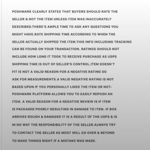 -I PLACE MUCH IMPORTANCE ON BUYERS WHO HAVE PREVIOUSLY PURCHASED FROM ANY BUYER ON POSHMARK AND FOLLOWED PROPER PROTOCOL-ACCEPTED PURCHASE IN A TIMELY MANNER, LEFT A STAR RATING & A LEFT AN OPTIONAL KIND COMMENT.REVIEW MY NUMEROUS FEEDBACK RECEIVED FROM MY VALUED CUSTOMERS