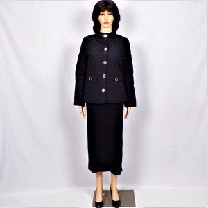 THIS LOVELY BLACK DIAMOND-QUILTED LIGHT JACKET BY JANE ASHLEY, SIZE S, is pre-owned, but in near-perfect condition, free of defects or damage, with no signs of wear. It has 1 button at each sleeve end, natural (i.e. unpadded) shoulders, a low standup collar, pockets with button-down flaps in the lower front, and a 5-button closure in front. The buttons are large, shiny gold-tone metal. It's fully lined in glossy black fabric (picture #11). The fabric, outer and lining, is 100% polyester, machine wash cold and tumble dry low or dry clean are recommended. The stated size is S, but prospective buyers are encouraged to compare the measurements with those of a jacket that they know fits well prior to purchase. Measurements are: chest, pit to pit 18.5"; waist 16.5"; hemline 19.5"; shoulder 15.25"; sleeve 23.5"; length (in back, collar seam to hem) 24".
