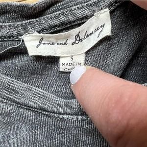 Jane and Delancey tunic top, size small. Acid washed / distressed gray fabric with a twisted accent on the front and short sleeves that are a little bit longer and super flattering! A couple of small discolorations that I think are part of the distressed coloring and a tiny hole in seam in armpit where a tag might have been, please see pics for details and flat lay measurements. Smoke and pet free home. Thanks!