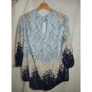 Janette Plus Cold Shoulder Cherry Blossom Print Double Button Back, 2X. Excellent preowned condition, no visible rips or stains. Blue ombre background with cherry blossom print. Hand washing suggested, 100% Rayon. Size 2X, measures 20 inches from pit to pit and 27 inches from shoulder to hem. All items clean and ready to wear. Items ordered before 12 noonn Central time ship that day. Smoke and pet-free environment.
