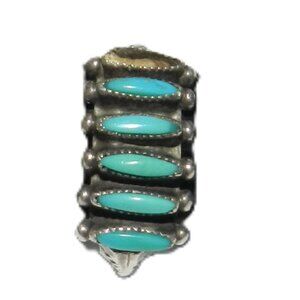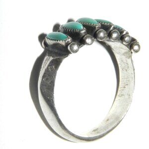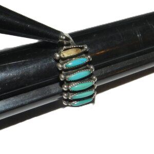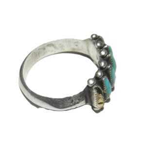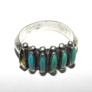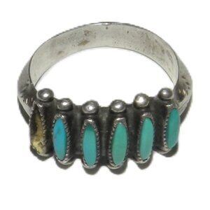 he design features the "needlepoint" or "petit point" technique, a distinctive style of the Zuni people that involves cutting small turquoise stones into elongated, pointed shapes to create a mosaic-like pattern. It is made of sterling silver, with six natural turquoise stones set in pronged settings. This ring is missing one stone.