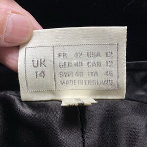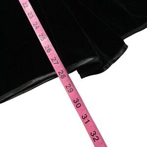 This vintage black Janice Wainwright skirt is a stunning addition to any formal occasion. The silk and rayon blend velvet fabric gives it a luxurious feel and a subtle sheen. The A-line style and midi length make it a versatile piece that can be dressed up or down. Featuring a zip closure and lined with pockets, this skirt is both practical and elegant. The solid pattern and black color make it a timeless piece that can be worn to weddings, parties, or any formal event. Dry clean only for optimal care.