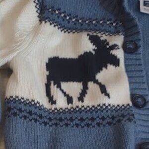 JANIE AND JACK, BLUE AND WHITE, BUTTON FRONT CARDIGAN, MOOSE MOTIF, 100% COTTON, LIKE NEW, BABY SIZE 18-24MO