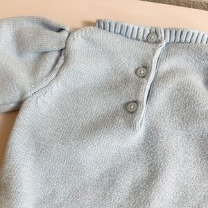 Beautiful, precious JANIE&JACK sweater for your little one. Features puff sleeves and a ribbed trim for a modern, classic feel. Button Back and machine washable. This is a lovely soft blue with a thoughtfully placed and beautiful appliqué. Sold out online.