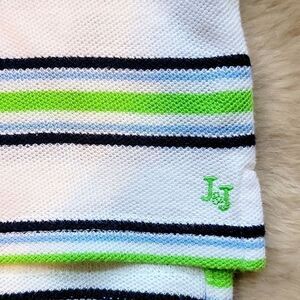 100% cotton polo top, white with blue and green stripes, J&J embroidered on front left!