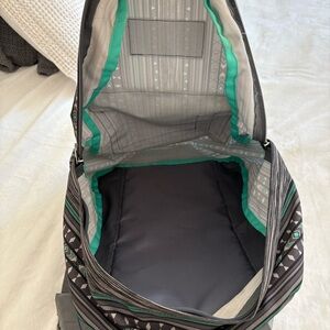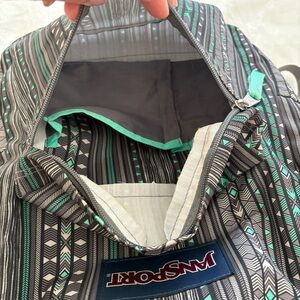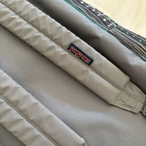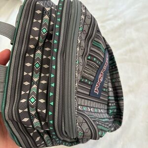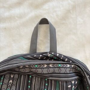 Eye-catching JanSport backpack with geometric stripes. Features black and green tones. Perfect for daily use.