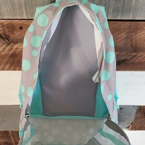 Jansport SuperBreak Backpack. Light teal/mint green polka dots with gray. Top tab carry web handle, padded adjustable shoulder straps for comfortable carrying, front zipper pocket with organizer & main zipper compartment, front logo patch, woven construction made of 100% polyester. Bag size approximately 13" x 17" x 5". No rips, snags or stains. Like new condition!