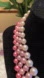 There are small crystals between each pearl and bead. The colors vary from white to pale pink, medium pink and a darker pink. The clasp Isa hook clasp. The longest length hooked is 17 1/2”.