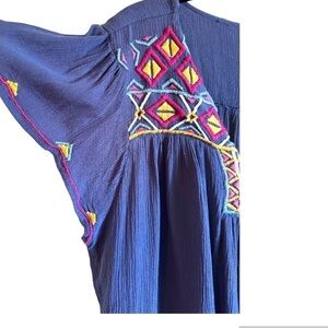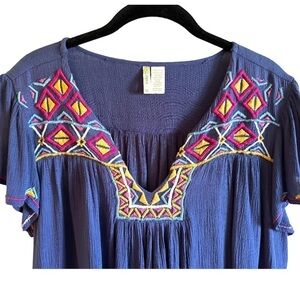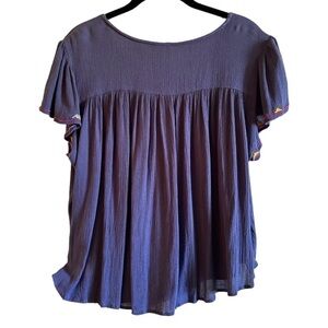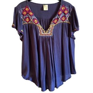 JAPNA, WOMENS, SHORT FLUTTER SLEEVE TOP. EMBROIDERED YOKE WITH V-NECK. BLUE WITH MULTI COLOR STITCHING. FULL FLOWY TOP. SIZE M