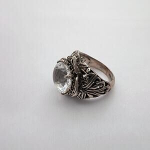 A stunning and substantial sterling silver ring from the contemporary artisans at JARDA (Jewelry Arts of Danbury). This piece is a beautiful example of the Edwardian revival style, featuring intricate, lace-like filigree on the setting and shoulders. A large, brilliant-cut oval stone (likely white topaz or rock crystal quartz) sits at the center. The ring is marked "JARDA 925" on the inside. A high-quality, modern piece with the romantic feel of an antique.