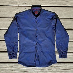JARED LANG After Dark mens long sleeve shirt. Size Small. This is a very slim fit. Worn once. Like new. The picture does not do justice to the deep indigo color and the unique tone on tone star design. Note the back tuck detail. The smaller collar length is intentional. Cotton. Please compare to what you currently wear so we can avoid a purchase - return - dance. I have included a visual schematic reference guide but refer to these measurements. Neck 15 " / Collar length 1 5/8" / Across Chest sleeve to sleeve 17 " / Across Armpits 18 " / Across Hem 20" / Top to bottom buttons 25 1/2" / Shoulder from collar to top of sleeve seam 6 1/2" / Sleeves - Inside 19 1/2" Outside 24 1/2" Armpit Opening 9". Any questions contact me prior to purchase.