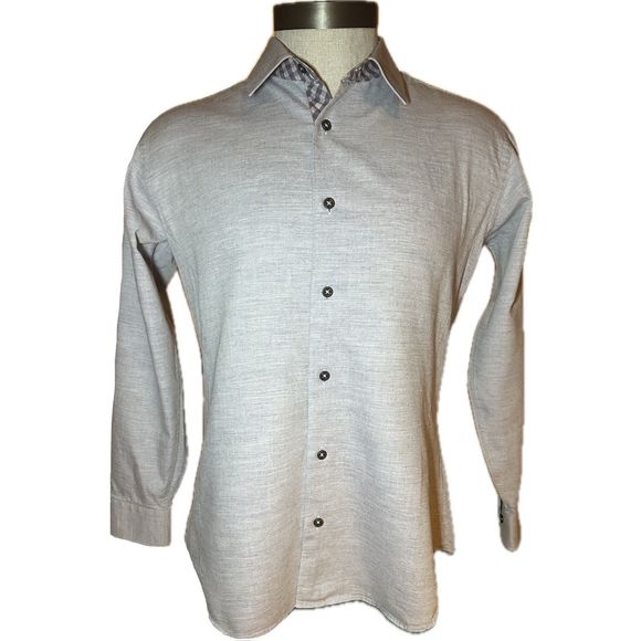 Jared Lang Men's shirt. Made in Turkey, 100% cotton, in excellent condition. Purple / pink plaid accents on collar & sleeves, awesome bronzed metal buttons (heavy too!). Brand's pink maple leaf on rear left shoulder. Please note measurement. True medium, Shoulders 18", PIP 21" Length 28". Arms (midline neck to sleeve) 32"