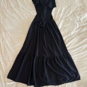 Chic and elegant black midi dress by Jason Wu. Features soft flutter sleeves, a scoop neckline, and a flattering tie open back. Crafted from a breathable rayon-linen blend (73% rayon, 27% linen), this dress is perfect for warm weather events or dressed-down casual days. Lightweight and flowy with a tiered hem for added movement.