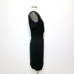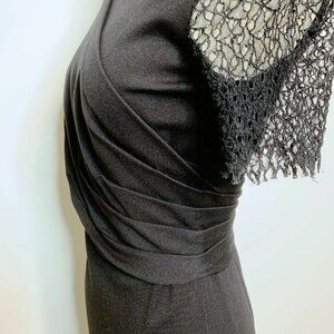 Brand: Jason Wu Size 4 Made in USA Care: Dry Clean Material 69% Rayon, 28% Nylon, 4% Polyurethane; Combo: 65% Cotton, 20% Polyamide, 15% Viscose; Lining: 95% Silk, 5% Lycra; Trim: 100% Rayon Details Black Lattice Lace Sheath Dress. Faux Wrap Top. Pleated. Lace Sleeves. Exposed zip in Back. V Neck.  Approximate Measurements Shoulder 14", Arm 9", Chest 30", Waist 25", Hip 34", Length 35"
