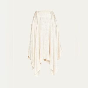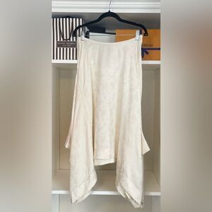 A beautiful special occasion skirt for the holidays. Would be a great bridal outfit for dinner or afternoon brunch. Pictures don’t do it justice! Has an asymmetrical modern hem with a raised floral pattern.Waist 14”, length at the longest point 36”. 100% viscoses with a silky feel.