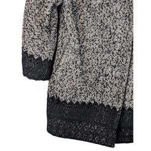Gorgeous Jaune Rouge black & white/light gray wool blend nubby tweed asymmetrical snap coat. Black lace trim at the hem & cuffs. Fold down collar. Wide sleeves. 2 front slant pockets. Fully lined. Boutique brand.