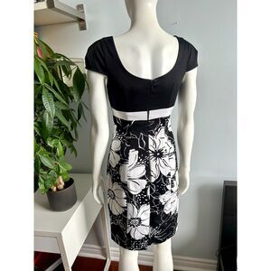 Knee-length sheath cocktail dress by Jax, featuring a black bust with pleat detailing, a round neckline and back, and a black and white floral skirt. Great for work, a cocktail party, a fancy dinner, or a night out. Size 4.