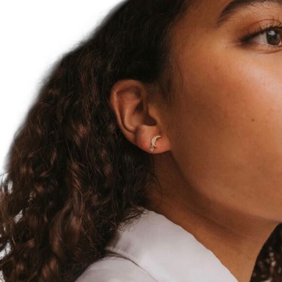 • A CZ-encrusted moon stud has a petite gemstone hanging from the center.