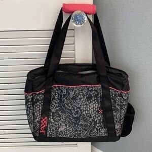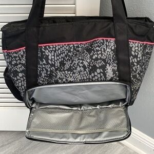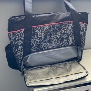 Great condition, JAXX insulated meal prep tote bag grey & black. Measures 16.5” across. The insulated bottom area for food containers measures 14” across and 6” tall. Can fit several containers and small ice packs. Has a cup holder on the side and protected laptop section on the inside. Is clean and from a smoke free/per free home.
