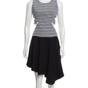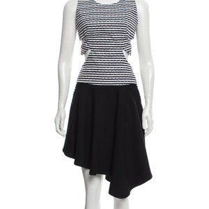 Navy, white, and black Jay Ahr sleeveless midi dress with scoop neck, striped pattern at bust, embroidery at front, exposed back, and exposed zip closure at center back.