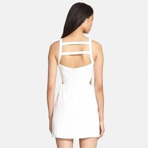 A red-hot hue, strappy top and leg-baring length amp up the wow factor of a fitted stretch-crepe minidress. Side-waist cutouts expose a hint of midriff for an on-trend finish