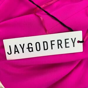 JAY GODFREY dress comes in a pink silk / lycra featuring a strapless style, draped detail, raw hem, and a back zip up closure.