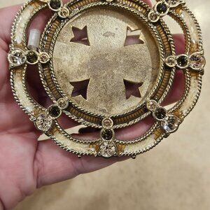 This is a RARE Jay Strongwater Frame. This LOVELY picture frame was purchased from Neiman Marcus . This piece is called, "Alexi." It is from the Blush collection. VERY RARE!! It is a LOVELY Swarovski crystals and marked with the Jay Strongwater logo on the back. Made of enamel on the front and finished in a gold. It has enamel on the backside. It comes from a non-smoking home. Only displayed in a guest bedroom for a short amount of time before I changed the decor. Measures 2 3/4"H (at highest point) by approximately 2 7/8"W (at widest point.) It holds a 1 1/2" round picture. No missing crystals. Pictures of actual item.
