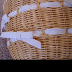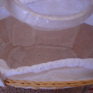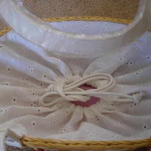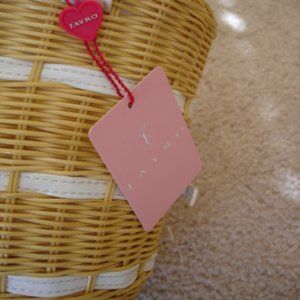 JAYRO is famous Japanese brand. This bag is new with tag. the measure appropriately: 12 inches wide, 6 inches tall, the Circumference is around 31 inches. The hardware has silver metal stand on the bottom and straps have hardware marked with JAYRO. drawstring closure on the top with white cotton fabric covered. The bamboo basket embraced with white butterfly bow. The bag inside has spacious space for all essentials.