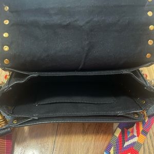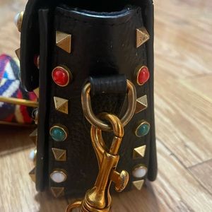 Small sized guitar ruckstud shoulder bag edged on the front and sides with colourful rivets. Sturdy in a boxed style, it has two shoulder straps - a wide guitar ruckstud strap as well as a thin studded strap. Both shoulder straps are detachable.