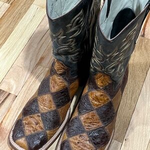 JB Dillion Boots. Checkered. Full Quill Ostrich Patchwork. USA. Size 12D. Made in Mexico. Looks great with jeans and dress slacks.  Boots are in immaculate condition. A statement for any outfit and occasion!