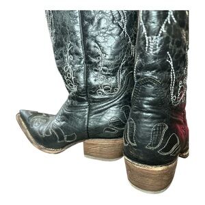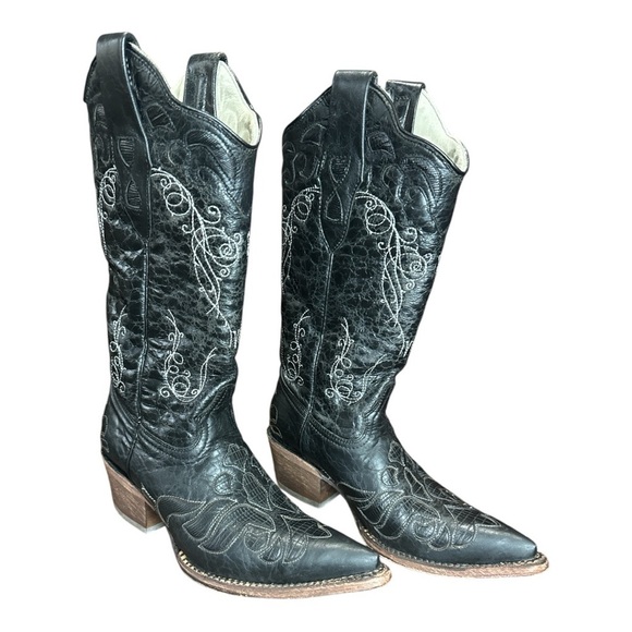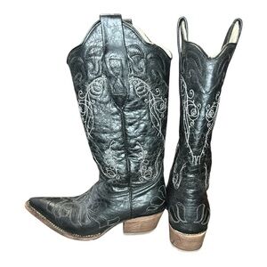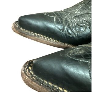 Stylish black cowboy boots with intricate white embroidery. Perfect for a Western look.