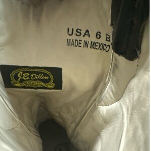 J.B. Dillon women's black cowboy boots with white stitching. These boots are made of black leather and feature intricate white embroidery designs on the shaft and vamp. J.B. Dillon is known for producing cowboy boots with attention to detail and quality craftsmanship. The boots in the image have a classic Western style with a pointed toe and a standard heel height, likely around 2 inches. The sole appears to be made of rubber, providing durability and traction. These boots, like many J.B. Dillon models, are pull-on style, meaning they do not have zippers or laces. Size 6B. Worn a handful of times. Great used condition. Small scuff on toes(pictured)