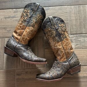 J.B. Dillon Women’s Western Boot size 8. Gently used and in great condition. A little bit classy, and a little bit sassy. With a distressed boot body, beautifully placed filigree accents and etched design on the heel , this western style from J.B. Dillon Reserve is a versatile boot that will keep you moving from busy morning to wild night.