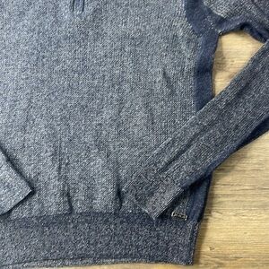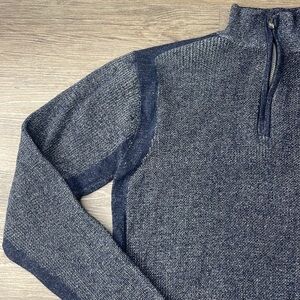 JB Holt Mens 1/4 Zip Navy Blue/Charcoal Grey Pullover Sweater, size medium. In good used condition. See pictures for measurements and fabric content.