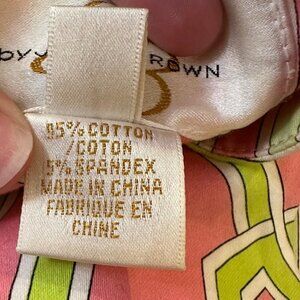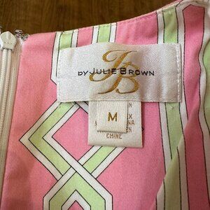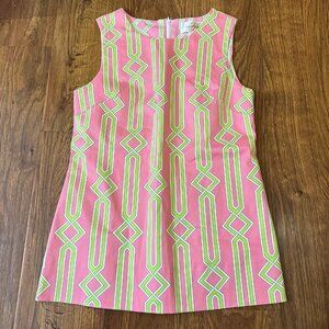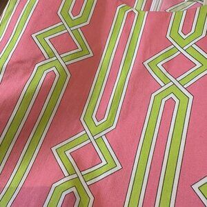 Julie Brown sleeveless tunic top in geometric pink and green trellis pattern