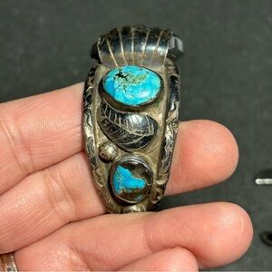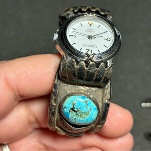 JB Turquoise Sterling Silver Flower Navajo Cuff Watch Carriage Timex Quartz Work one of tge turquoise stones is broken watch is a carriage by timex running with new battery see pictures for reference