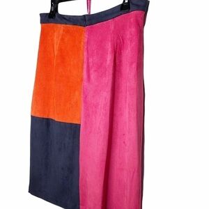 Brand New, Beautiful Henley House Party Color Block Skirt from JB by Julie Brown. This pretty Skirt features a soft, faux suede texture finish and fabric. Slim Pencil Skirt silhouette in a vibrant color block style. Colors are Bright Pink, Tangerine Orange and Navy. Hidden back zipper and fully lined. Polyester and Spandex blend with a bit of stretch. Woman’s Size Large