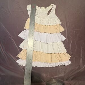 Stylish ruffle tank top. Features cream, peach, and lavender layers. Perfect for casual wear.